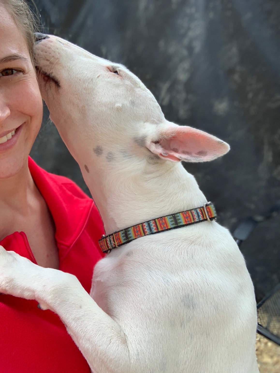 white terrier kissing woman